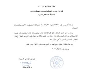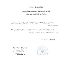 أصدر رئيس مجلس الوزراء نواف سلام، مذكرتين إداريتين تقضيان بإقفال كافة الإدارات العامة والمؤسسات العامة والبلديات لمناسبة عيد الفطر المبارك وعيد بشارة السيّدة مريم العذراء